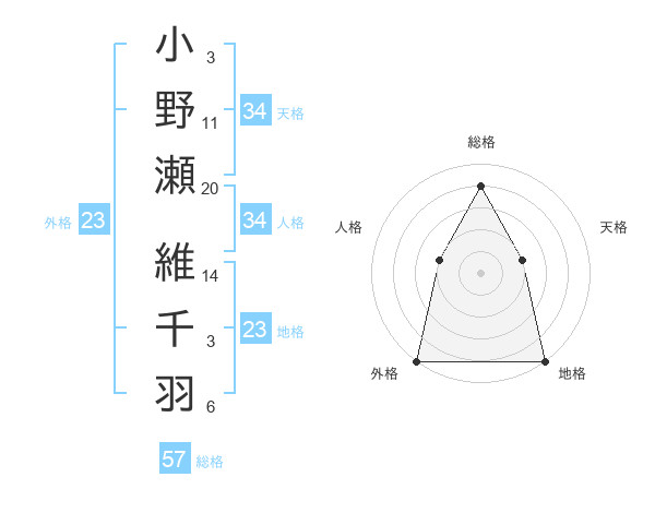 小野瀬 維千羽さんを姓名の画数から五運を鑑定