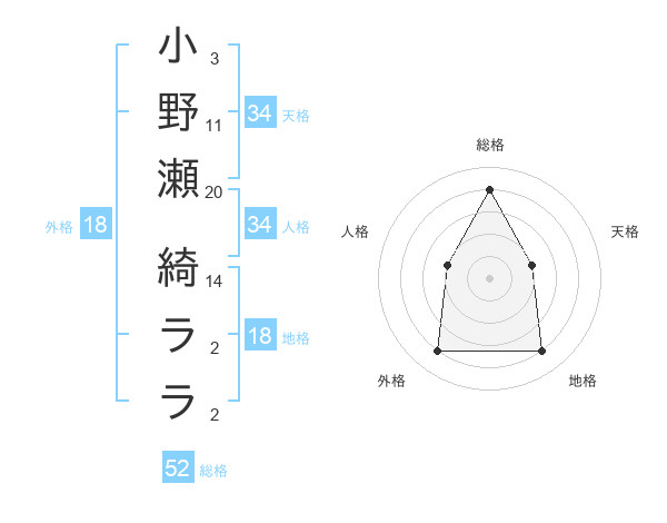 小野瀬 綺ララさんの総格は52画の4点!