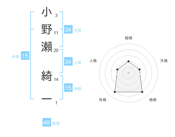小野瀬 綺一さんの総格は49画の2点