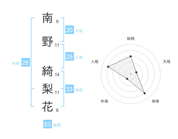 南野 綺梨花さんの総格は53画の3点!