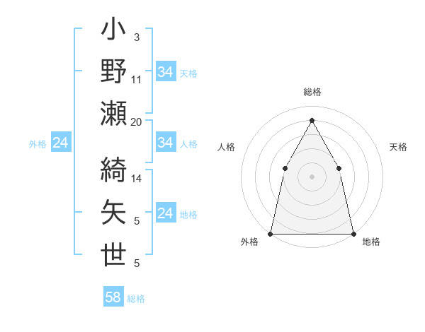 小野瀬 綺矢世さんを姓名の画数から五運を鑑定