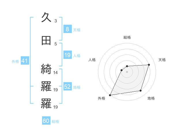 久田 綺羅羅さんを姓名の画数から五運を鑑定