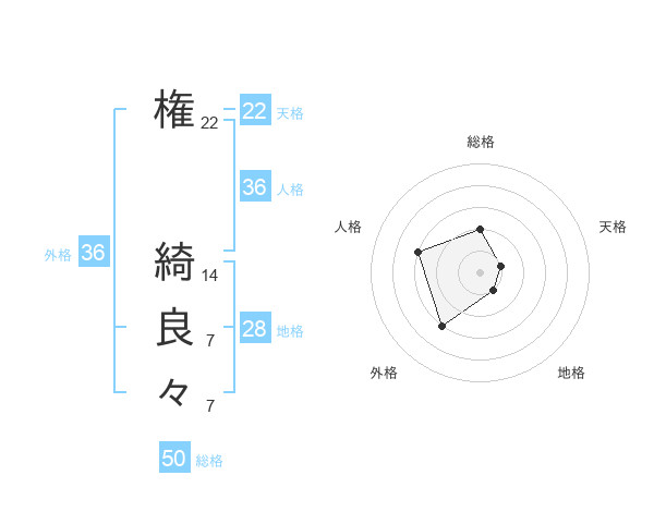 権 綺良々さんの総格は50画の2点!