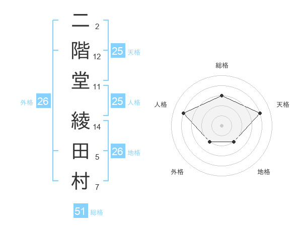 二階堂 綾田村さんの総格は51画の3点!
