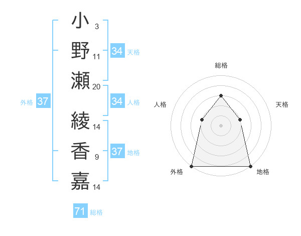 小野瀬 綾香嘉さんの総格は71画の3点!