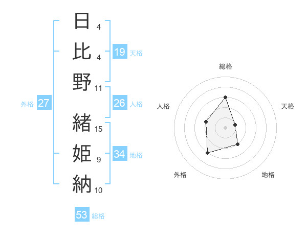 日比野 緒姫納さんの総格は53画の3点!