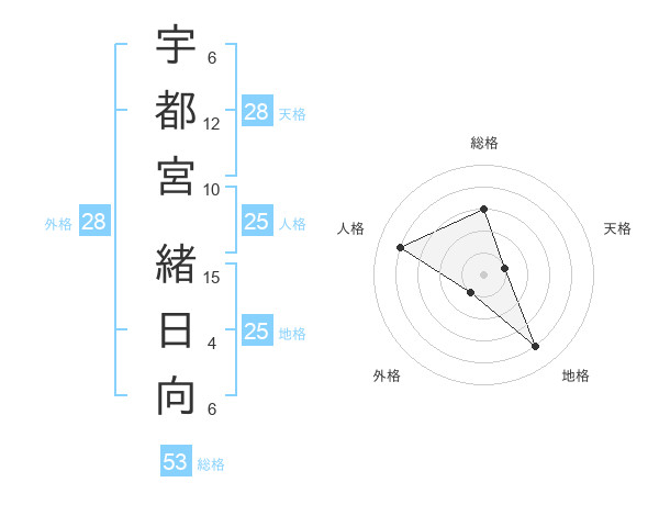 宇都宮 緒日向さんの総格は53画の3点!