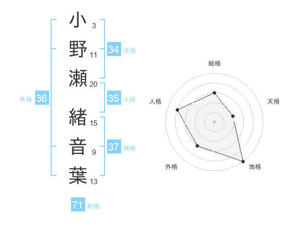 小野瀬 緒音葉さんを姓名の画数から五運を鑑定