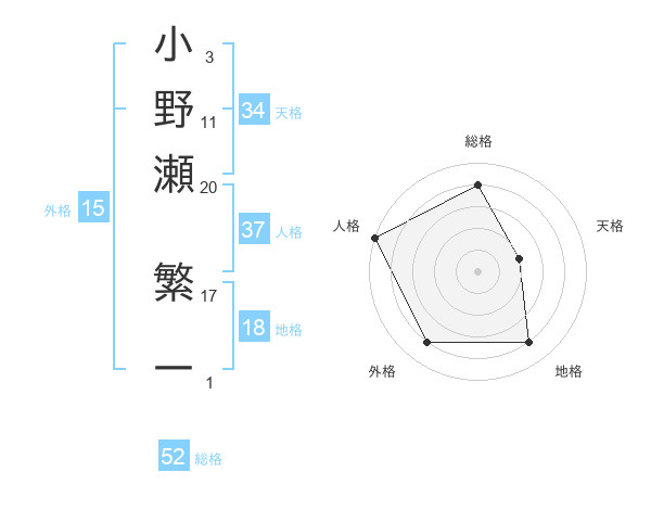 小野瀬 繁一さんの総格は52画の4点!