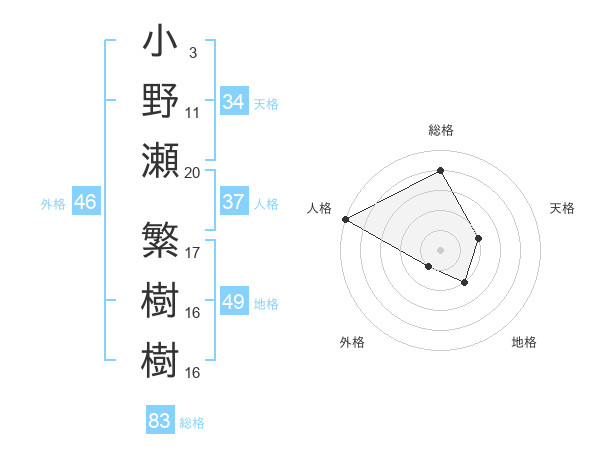 小野瀬 繁樹樹さんの総格は83画の4点!