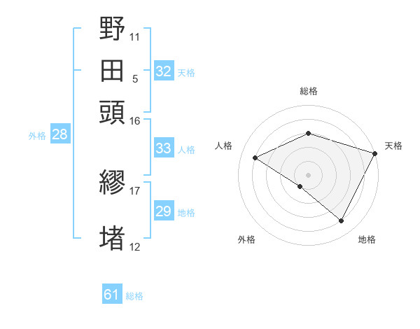 野田頭 繆堵さんを姓名の画数から五運を鑑定