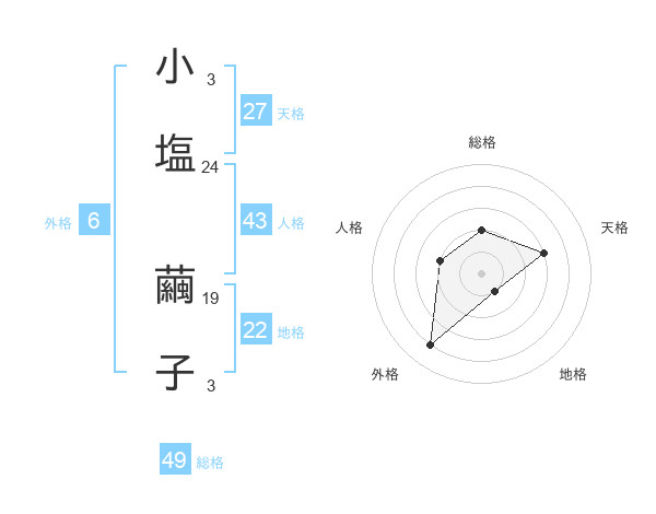 小塩 繭子さんの総格は49画の2点!