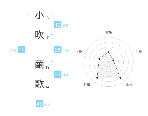 小吹 繭歌さんの総格は43画の2点!