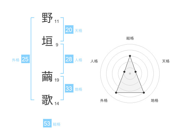 野垣 繭歌さんの総格は53画の3点!