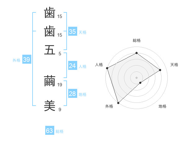 歯歯五 繭美さんの外格は39画の5点!
