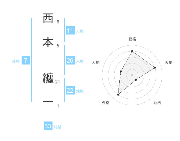 西本 纏一さんの総格は33画の4点!