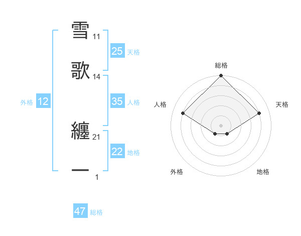 雪歌 纏一さんの総格は47画の5点!