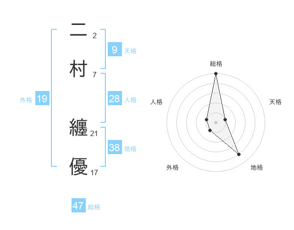 二村 纏優さんの地格は38画の4点!