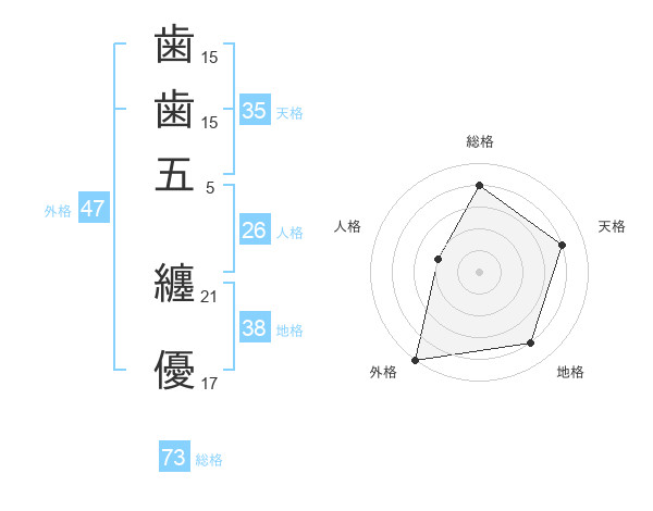歯歯五 纏優さんの総格は73画の4点!