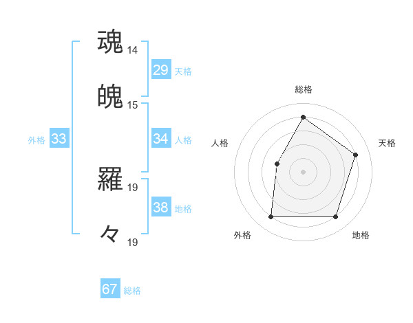 魂魄 羅々さんの総格は67画の4点!