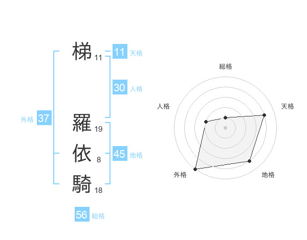 梯 羅依騎さんの地格は45画の4点!