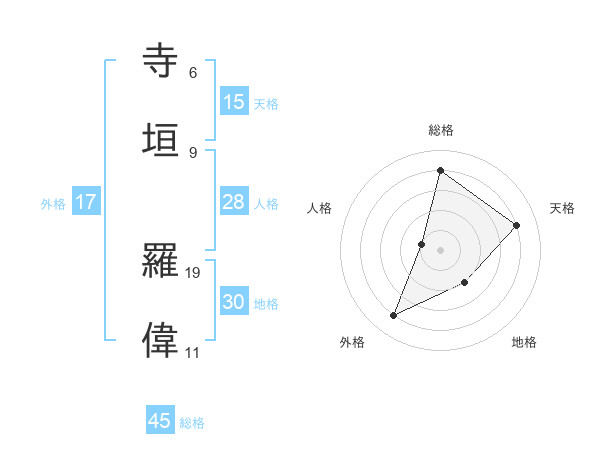 寺垣 羅偉さんの総格は45画の4点!