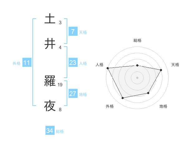 土井 羅夜さんの総格は34画の2点!