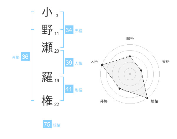 小野瀬 羅権さんの総格は75画の3点