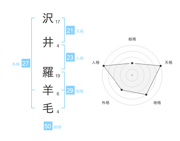 沢井 羅羊毛さんを姓名の画数から五運を鑑定