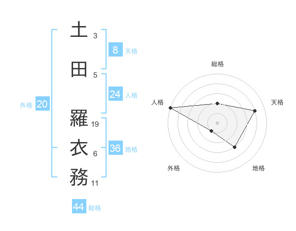 土田 羅衣務さんの総格は44画の2点