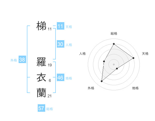 梯 羅衣蘭さんの総格は57画の4点!