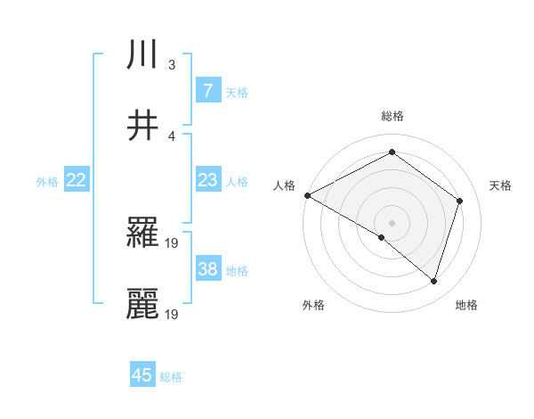 川井 羅麗さんの総格は45画の4点!