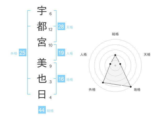 宇都宮 美也日さんの総格は44画の2点!