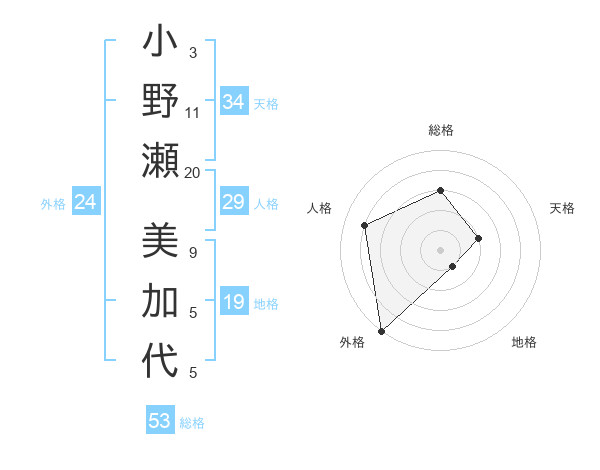 小野瀬 美加代さんの総格は53画の3点!