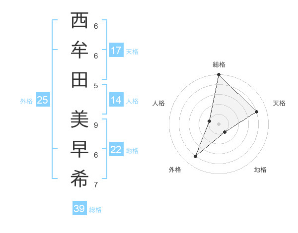西牟田 美早希さんの総格は39画の5点!