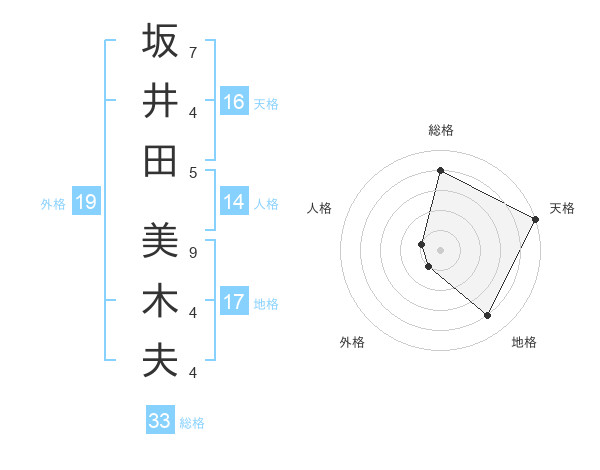 坂井田 美木夫さんの総格は33画の4点!