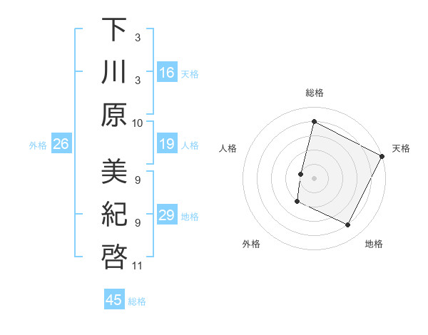 下川原 美紀啓さんの総格は45画の4点!