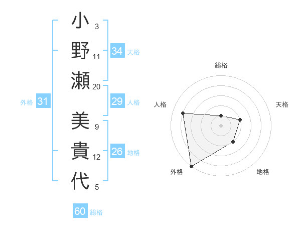 小野瀬 美貴代さんを姓名の画数から五運を鑑定