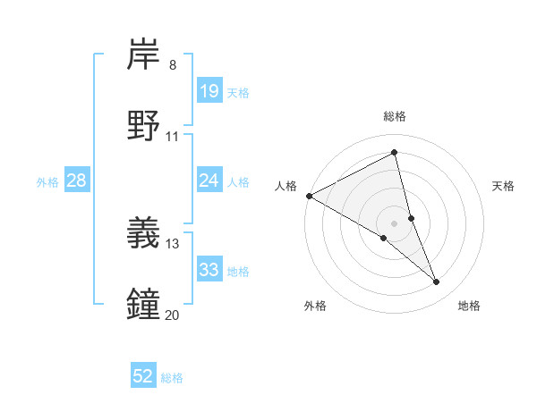 岸野 義鐘さんの総格は52画の4点!