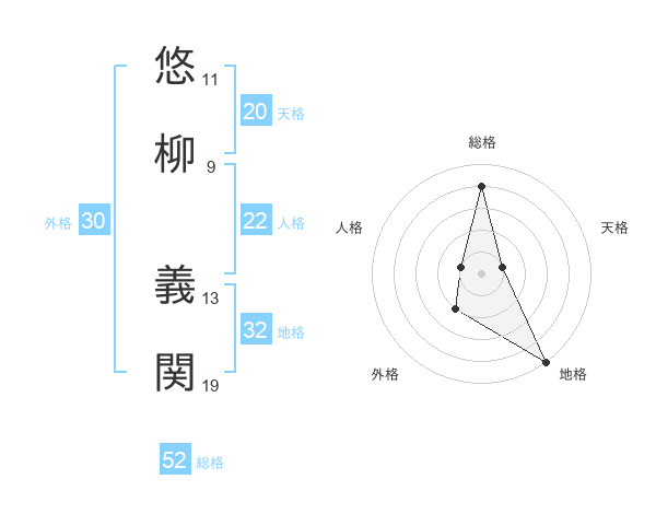 悠柳 義関さんの総格は52画の4点!