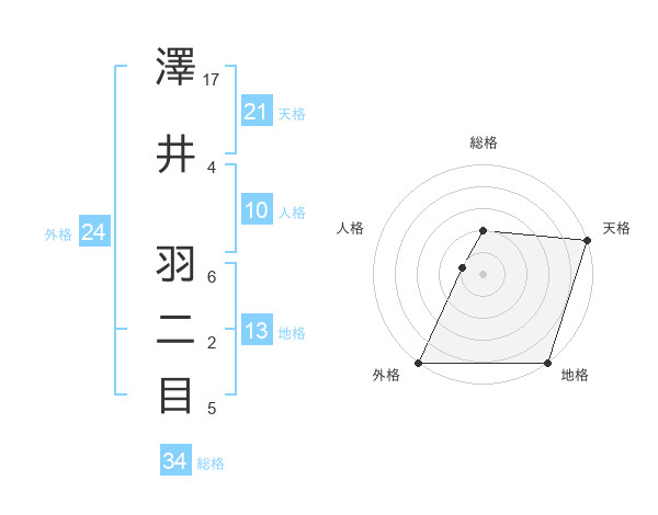 澤井 羽二目さんを姓名の画数から五運を鑑定