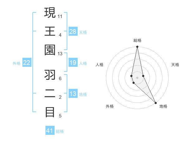 現王園 羽二目さんを姓名の画数から五運を鑑定