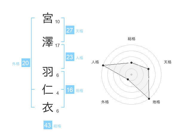 宮澤 羽仁衣さんの総格は43画の2点!