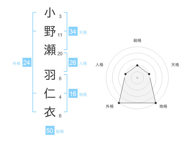 小野瀬 羽仁衣さんの総格は50画の2点!
