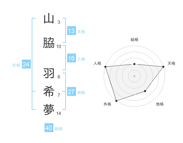 山脇 羽希夢さんを姓名の画数から五運を鑑定