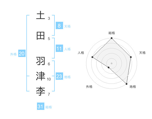 土田 羽津李さんを姓名の画数から五運を鑑定