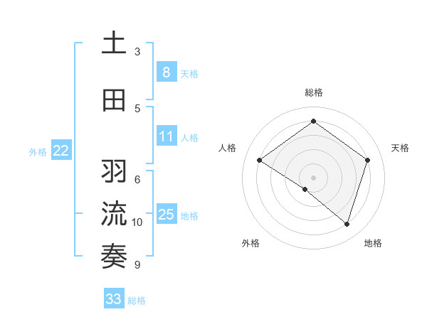 土田 羽流奏さんの総格は33画の4点