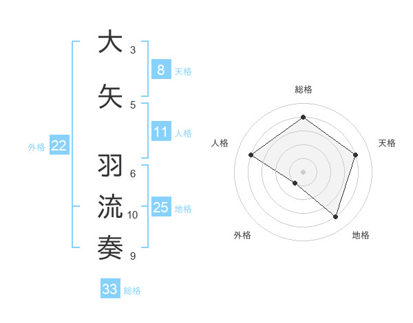 大矢 羽流奏さんを姓名の画数から五運を鑑定