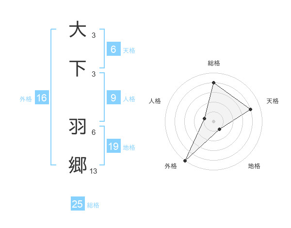 大下 羽郷さんを姓名の画数から五運を鑑定