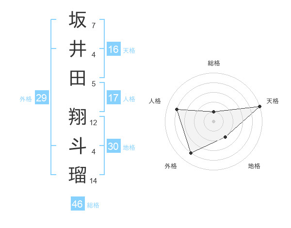 坂井田 翔斗瑠さんの総格は46画の1点!